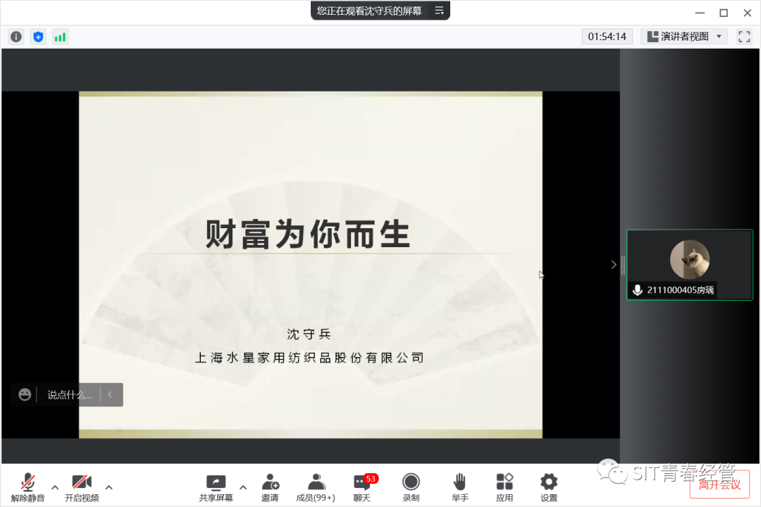 为全面推行劳动教育,树立正确的劳动观、财富观,2022年5月10日晚,公司举办“新时代先进人物进校园”线上专题报告会,上海水星家用纺织品股份有限公司党委书记、技术中心总监、正高级经济师、公司外聘教授沈守兵先生为同学们带来了题为“财富为你而生”的精彩讲座。