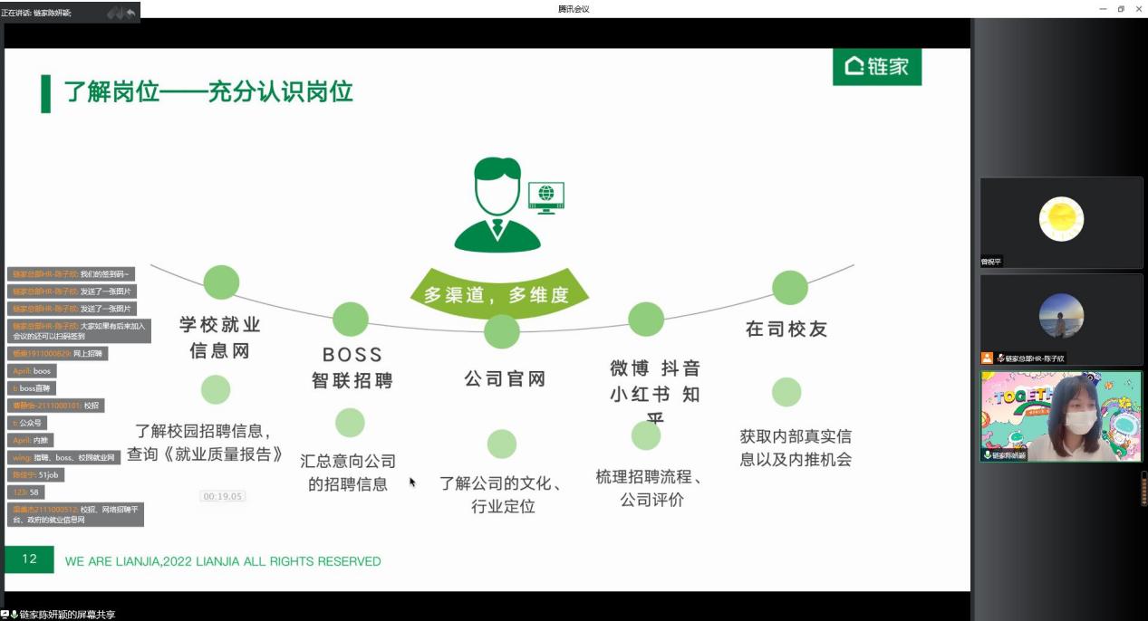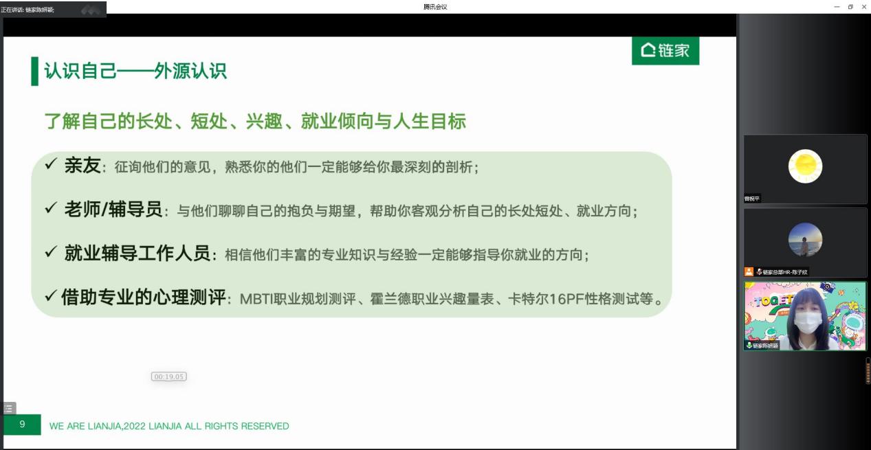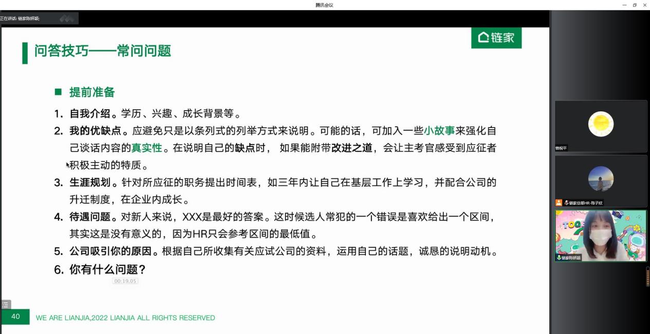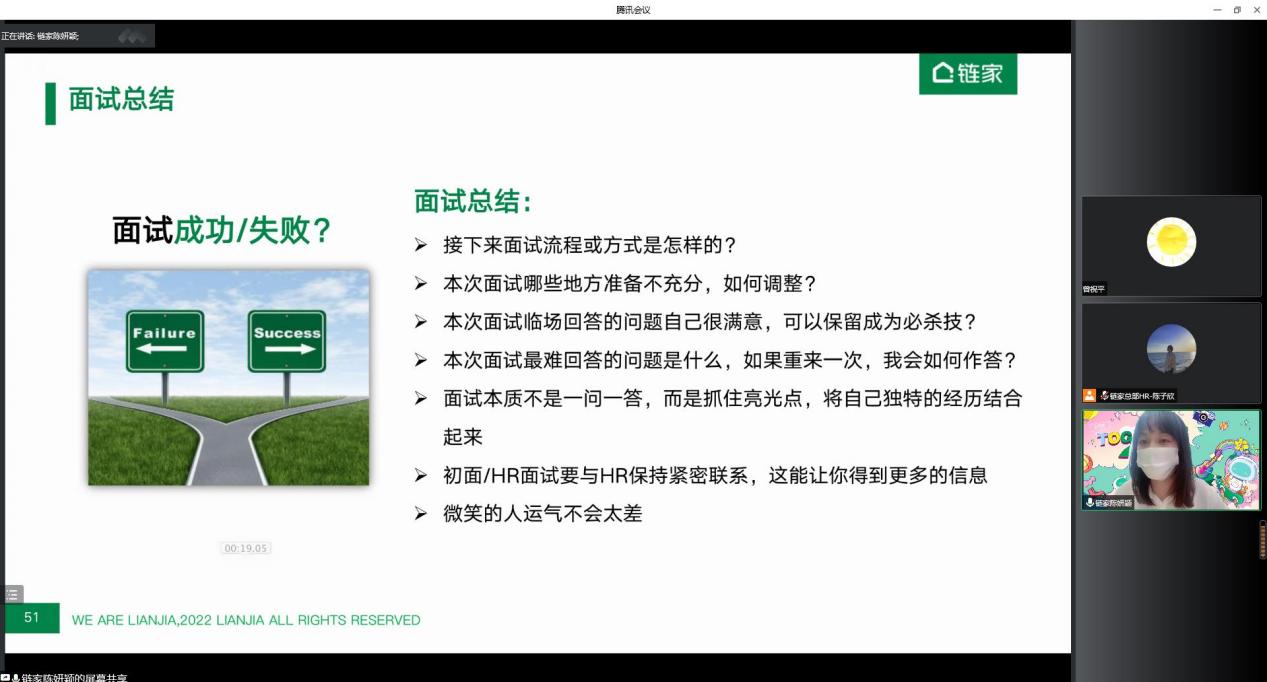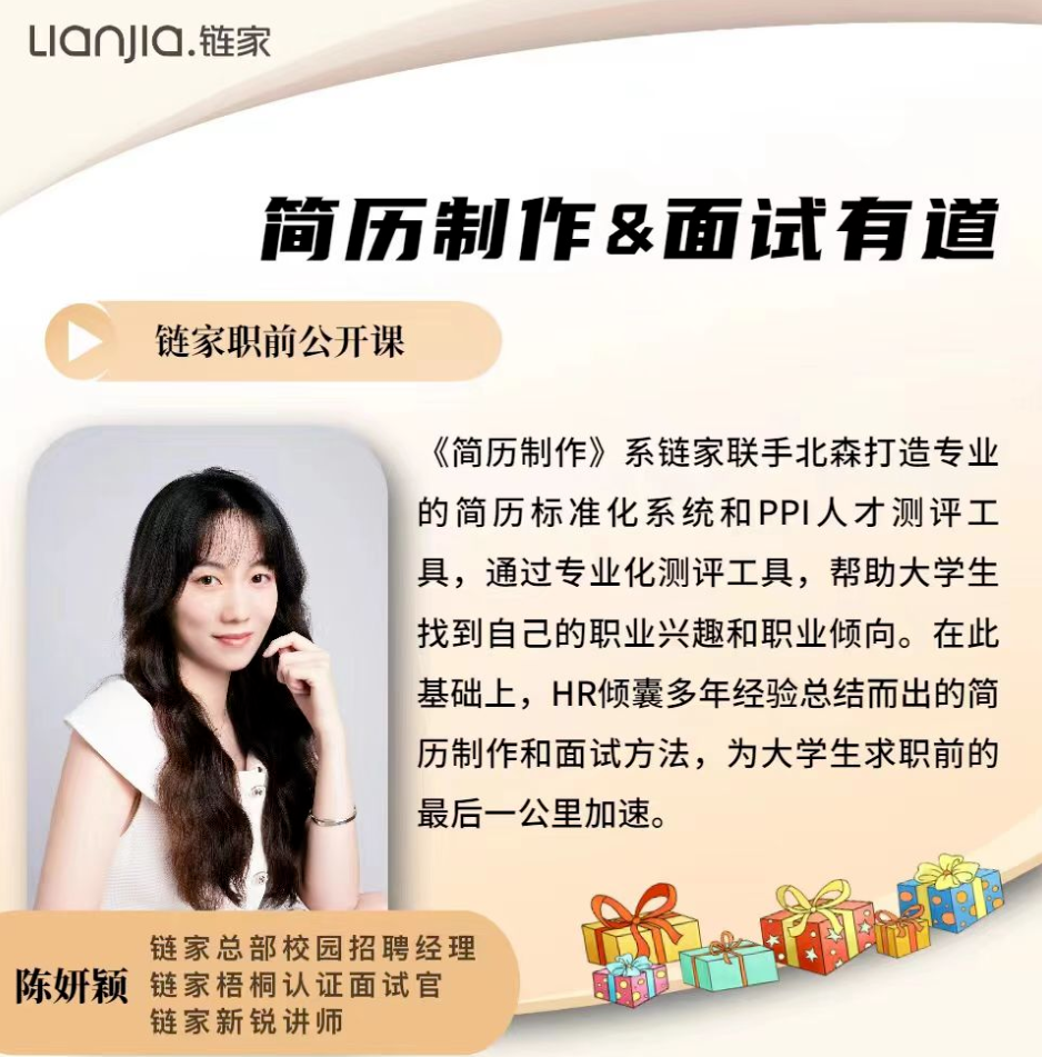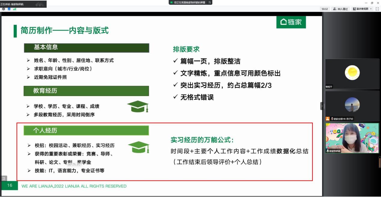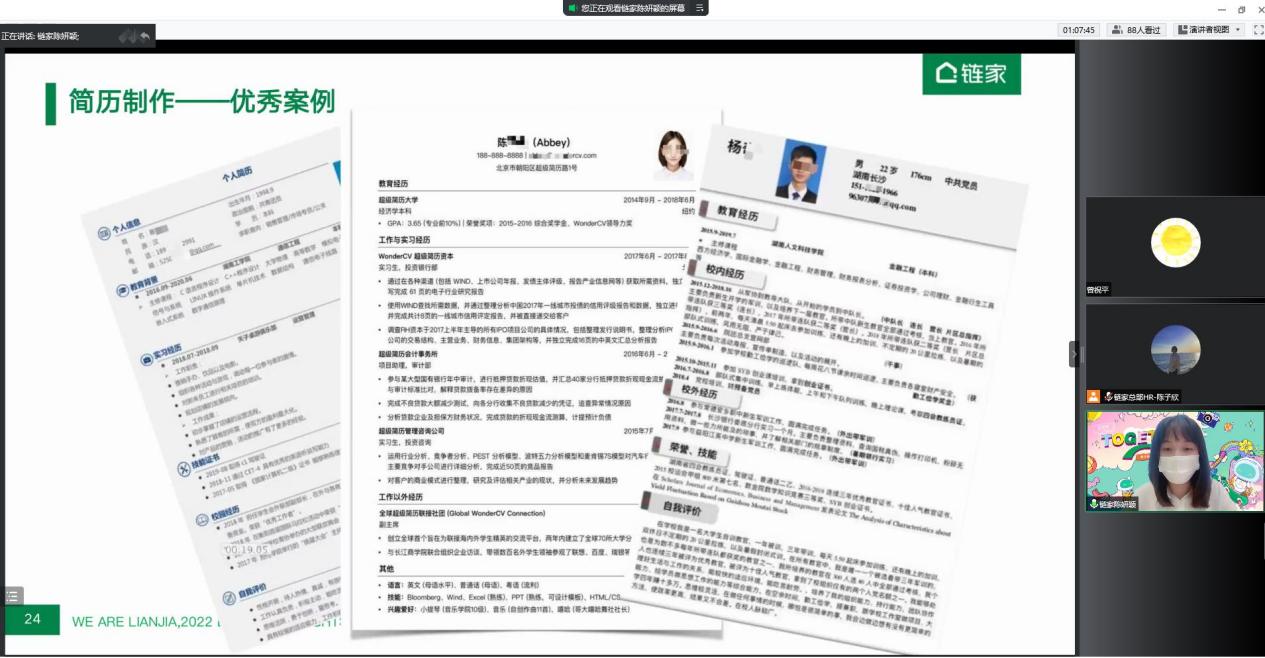 2022年秋季招聘已拉开帷幕,为了提升同学们的求职素养,增强求职能力,88858cc永利官网于9月9日下午举办了“职”引未来就业指导系列讲座——简历制作&面试有道线上公开课,课程面向全体研究生、本科生。讲座邀请了链家总部校园招聘经理、梧桐认证面试官陈妍颖老师为同学们进行授课。她指导求职学子们在简历制作时充分认识自己,在面试前掌握实战技巧,面试时充分展示个体优势、力争斩获offer。